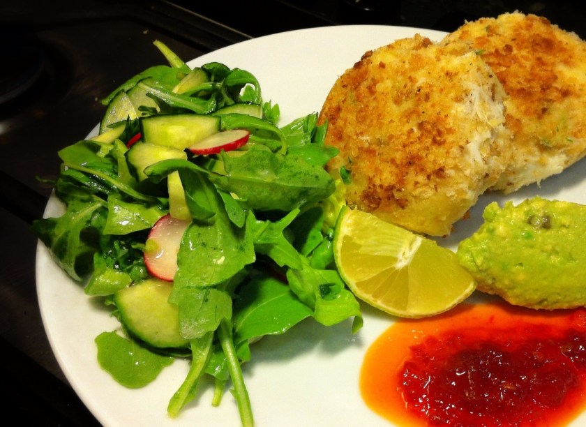 One of the best things about hosting a launch party/focus group for a catering venture is that the fridge is full of leftovers for quite a few days afterwards. This has led to a string of easy dinners and last nights Crab Cakes were no exception. In fact the tinned crab and curry paste were surplus items from filming rehearsals and the chilli jam and salad were from the bash. It was lovely to pull together ingredients from these two projects, an edible reminder that I have actually started making good use of my time by working and watching a little less of our Fraiser box set!