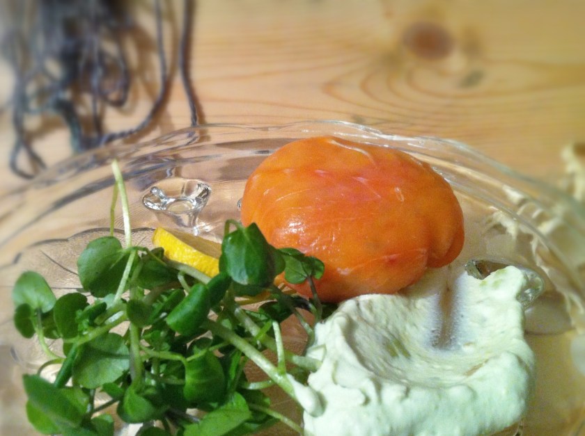 When I made mine I laid the salmon flat on a sheet of clingfilm, placed a spoonful of the prawn mixture in the centre, gathered the salmon over it and then twisted the cling film around it to form a sphere. I let them rest for a few minutes in the fridge before unwrapping them and flinging them on a plate with the avocado dip and some fresh watercress.