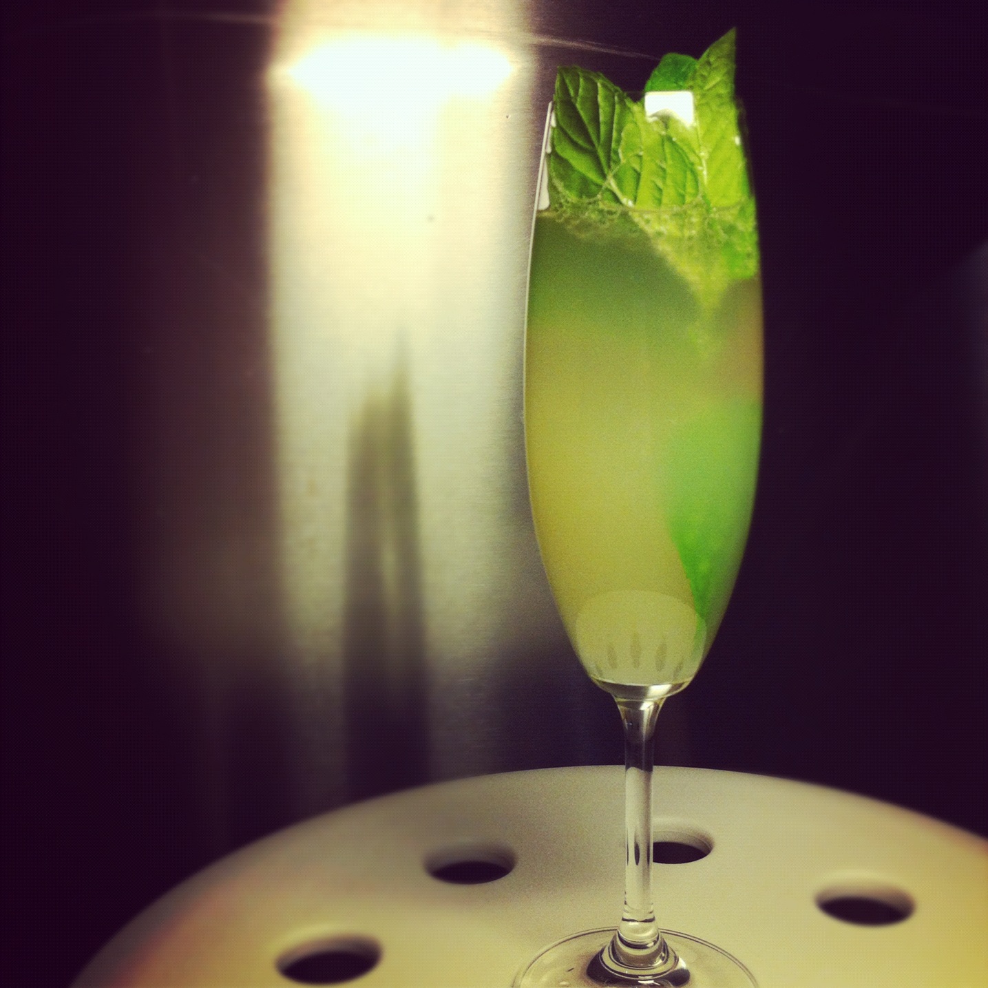 1) Place a whole sprig of fresh mint into a champagne flute.
