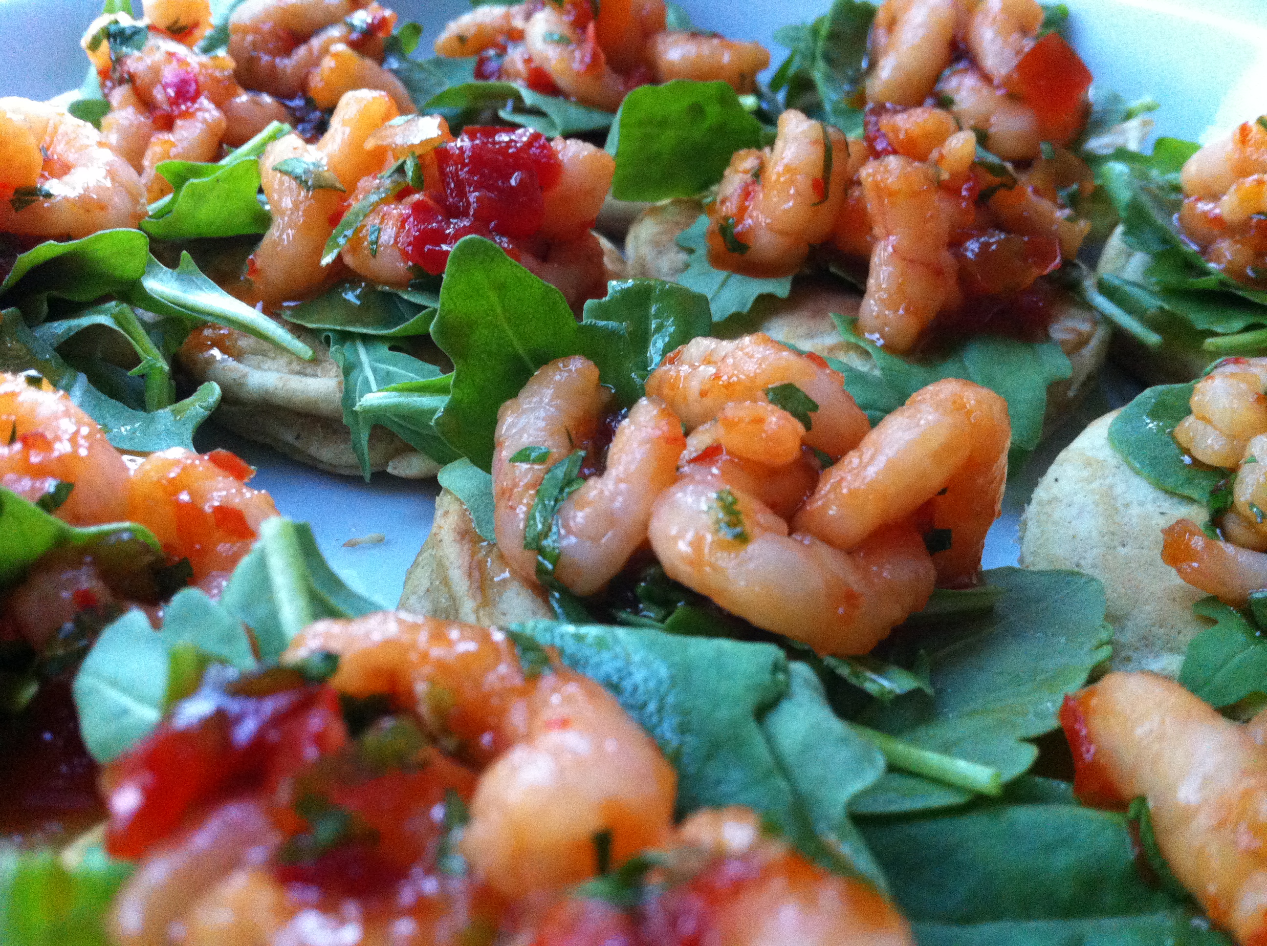 Because canapés are small you can have real fun with the flavours and reinvent classics to fit your theme. Pastry or mini pancakes make great bases so why not try adding additional flavours to the mix. Add fresh dill to blini batter before frying and top with sour cream and salmon or Bradley’s creation of cooked prawns mixed with chilli jam and fresh rocket – delicious!