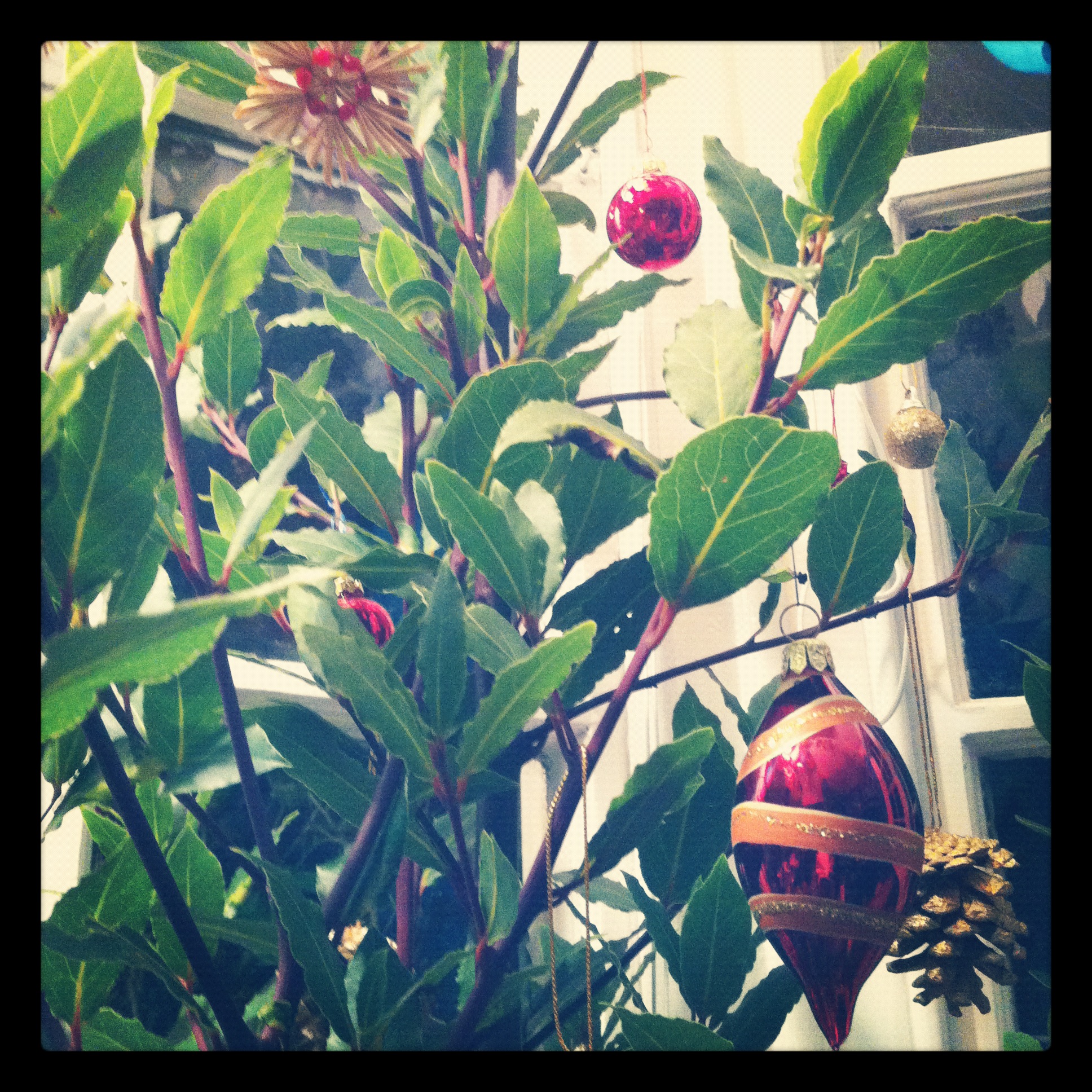 I’ve been itching to get the baubles and crepe paper out ever since I spied a thrifty Christmas tree alternative out the window, in the form of a rather enthusiastic shoot on the bay tree in the front garden. It’s the perfect Christmas tree shape (in my eyes anyway) and I thought if we lopped it off our housemates might think we’ve been busy doing some really helpful garden pruning (two birds, one stone – hurrah!) ..and bay smells great, triple win!