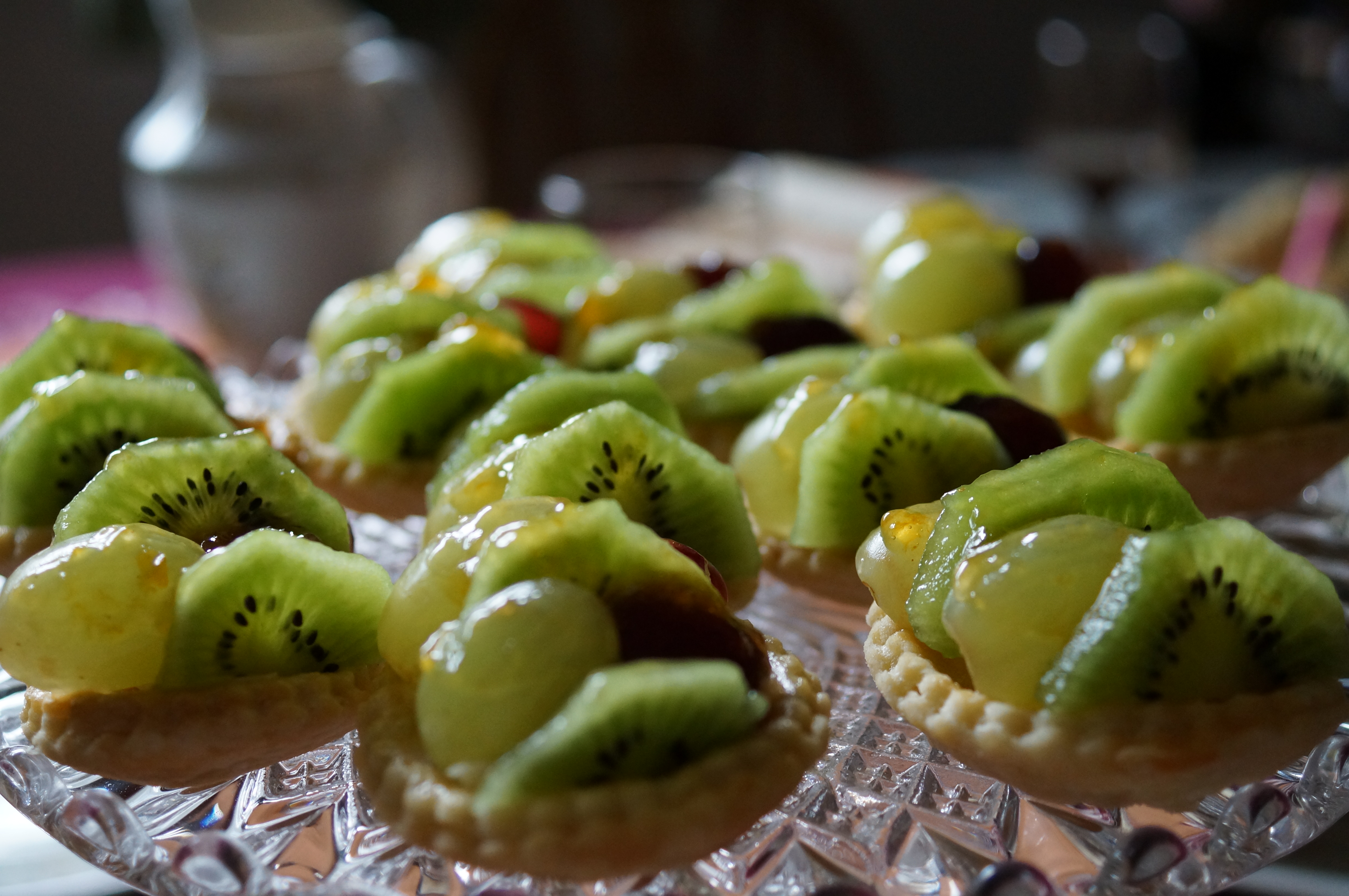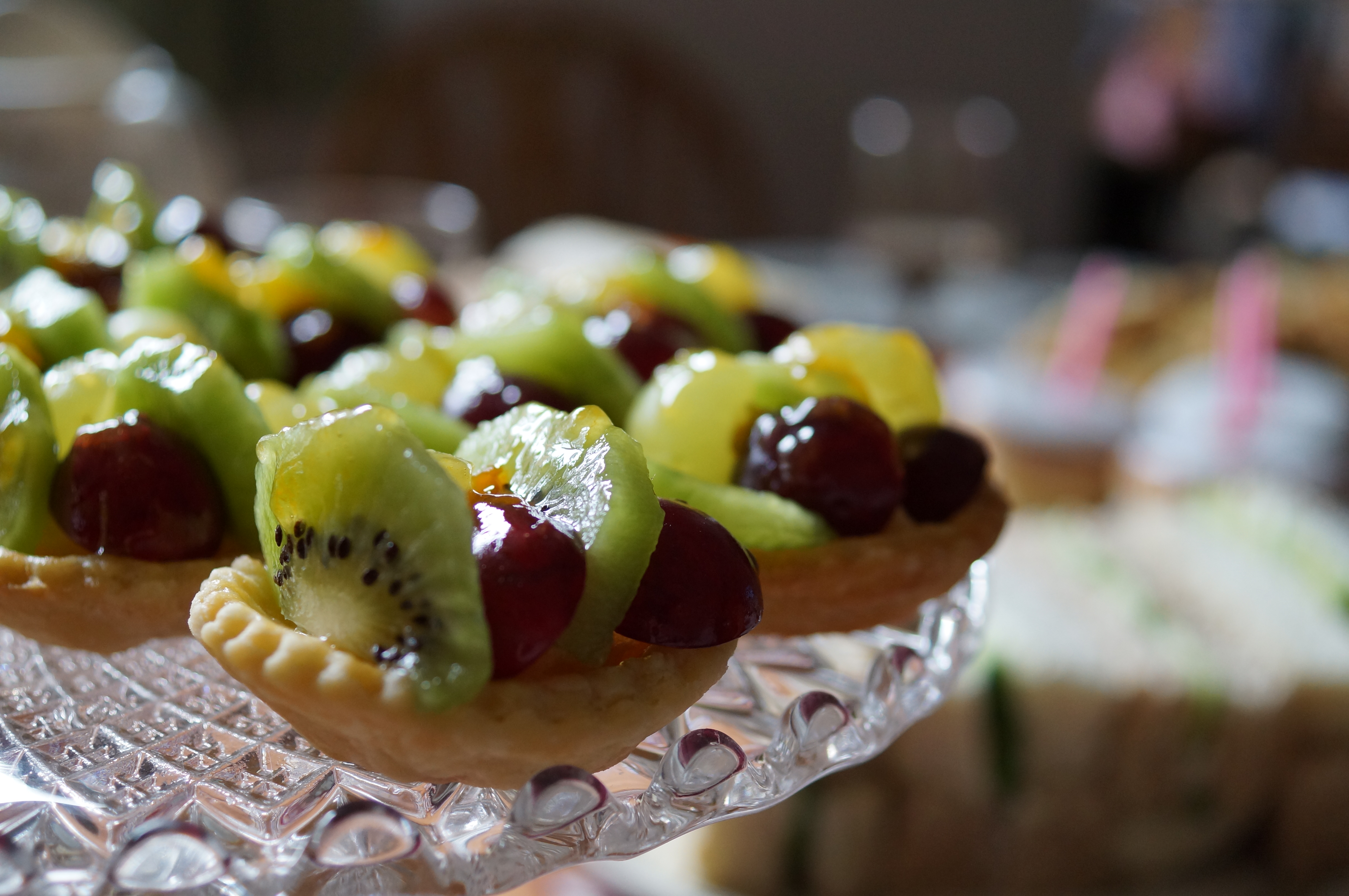 For a splash of colour I made some mini fruit tarts. I only had about an hour to make everything (so whipping up a batch of Crème Pâtissière was not an option). Instead I made a little bit of vanilla butter cream to put into the bottom of the tart shells – just enough to prevent the fruit from falling out! There wasn’t quite enough time to sieve the apricot jam or wash up the pastry brush after the egg washing either so I just encouraged the warmed, lumpy jam to vaguely cover the fruit with a teaspoon (ssshhh, I hope there are no Roux brothers reading this!). I think I got away with it, they tasted lovely and took a fraction of the time of the real thing: