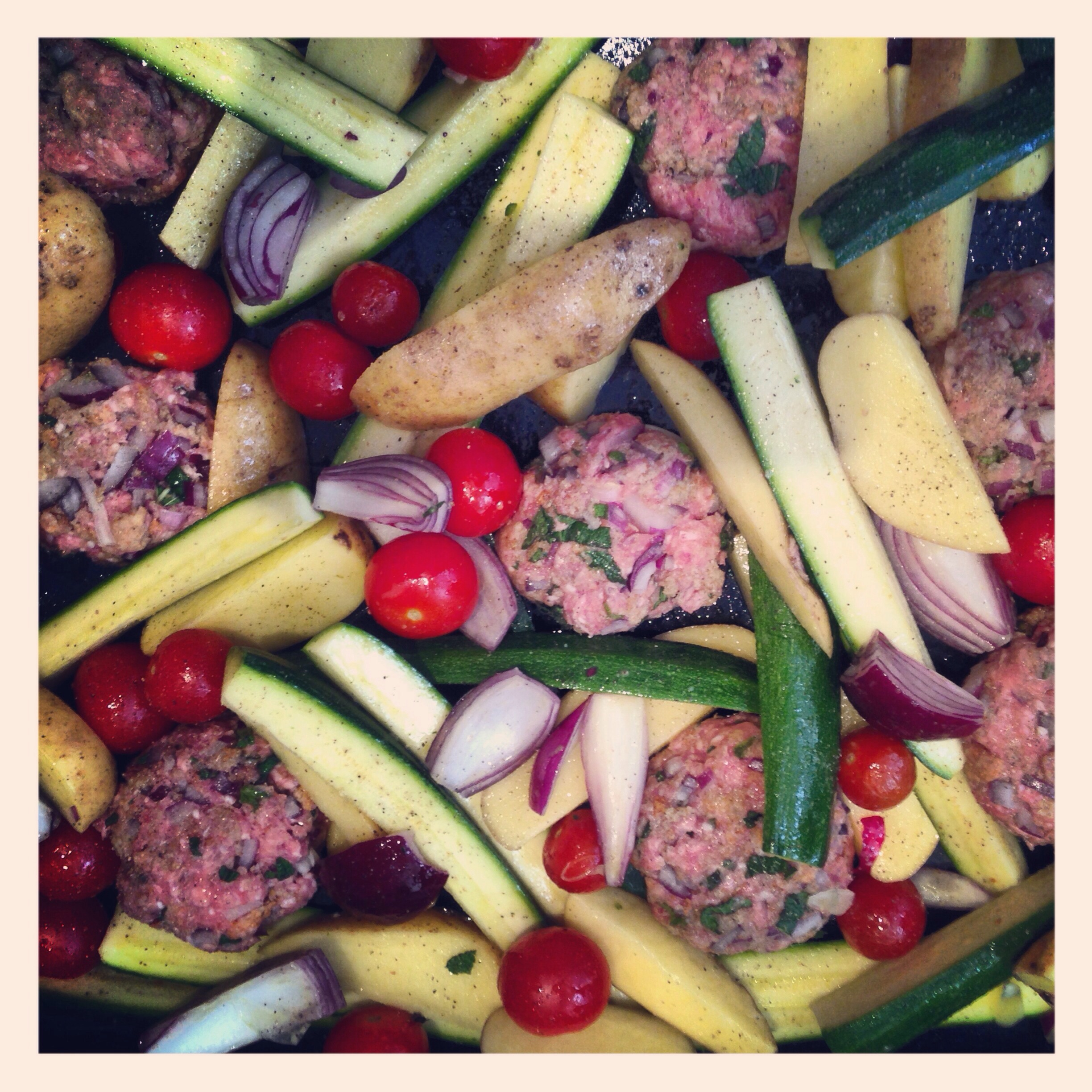 - Place the onion wedges on the tray around the lamb patties with the potatoes, courgettes and tomatoes. Drizzle with olive oil and season. Bake for around 40 minutes, turning & basting everything once halfway, until the lamb is cooked though and the vegetables are tender. Remove from the oven and sprinkle with the feta and remaining mint.
