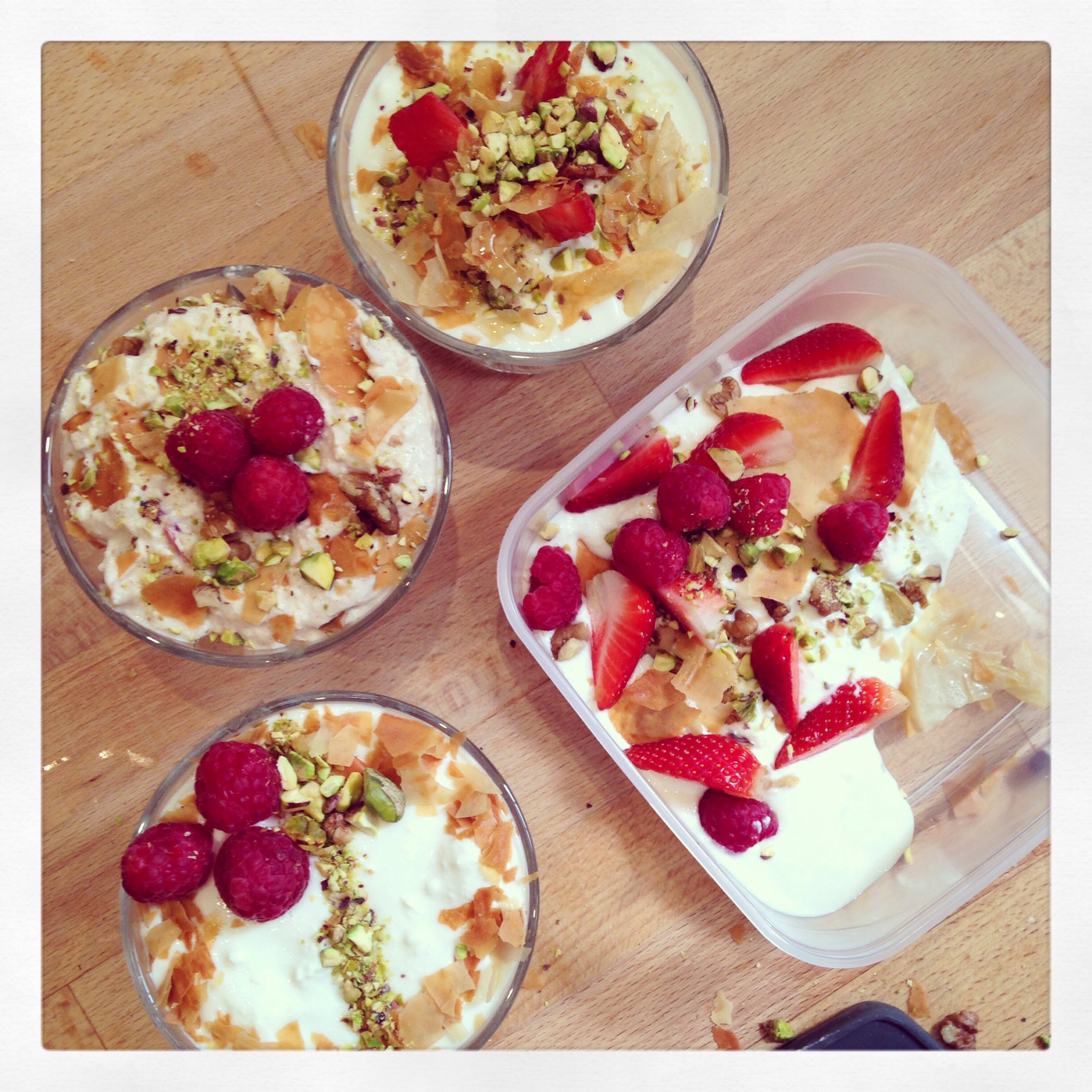 Eggs smashed and wine dispatched we started prepping our desserts of Anarocrema which is a layered dessert of crumbled filo pastry, a mixture of Total Greek Yoghurt, flavourings like cinnamon or rosewater and a type of cream cheese called Anari (made from the whey from halloumi) then topped with fruits, nuts and more filo.