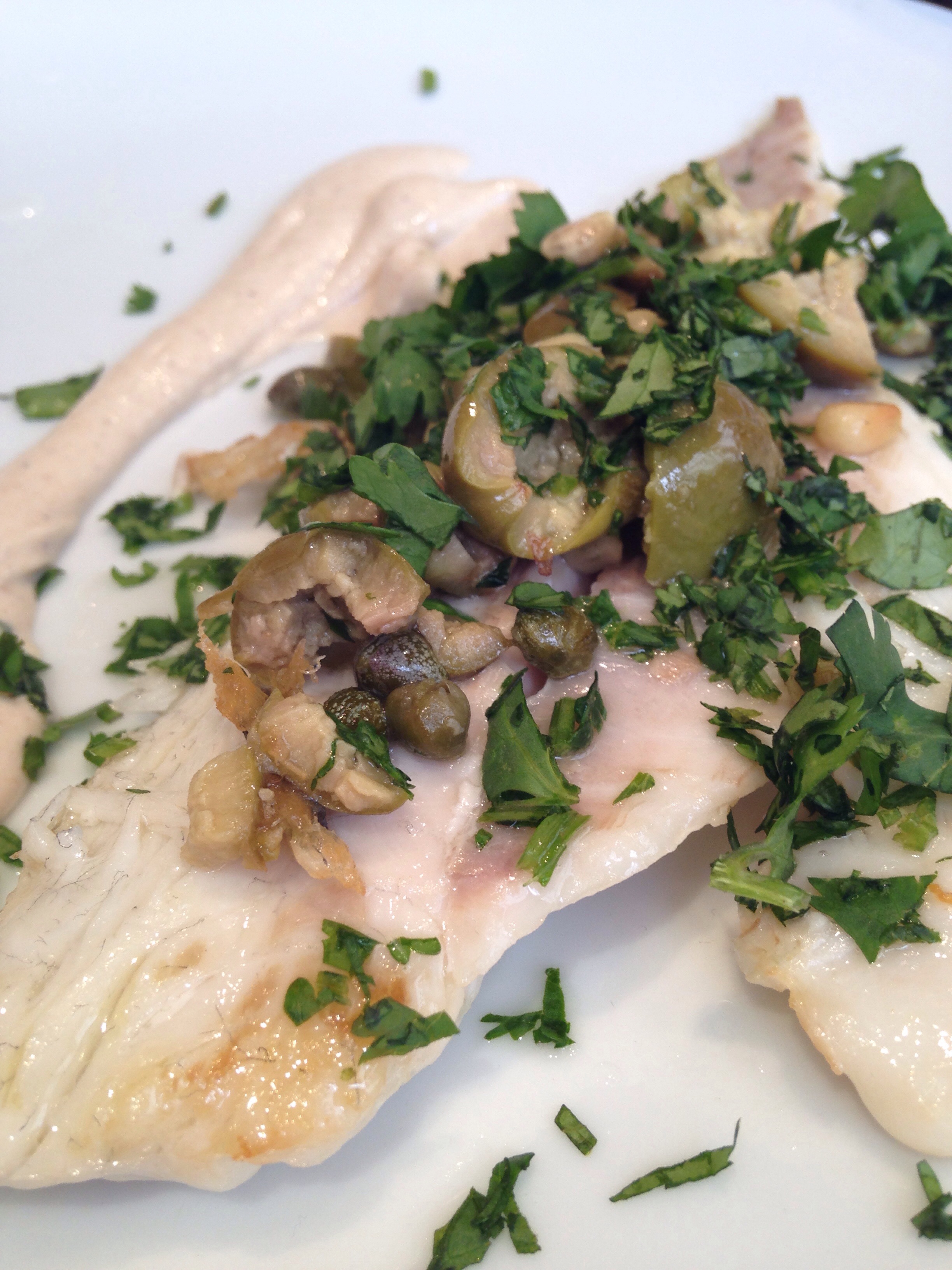 Greek Sea Bream Fillets with Olives, Capers, Lemon & Yoghurt Tahini Sauce
