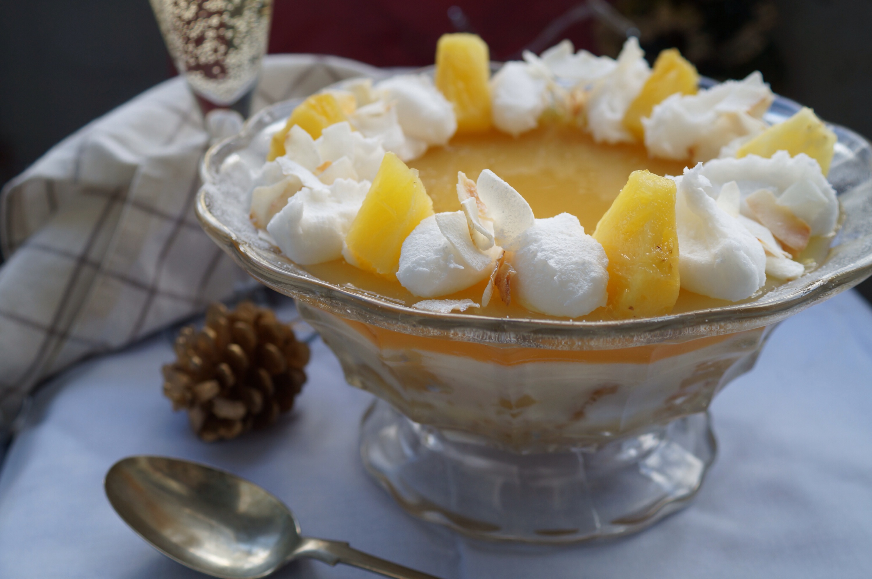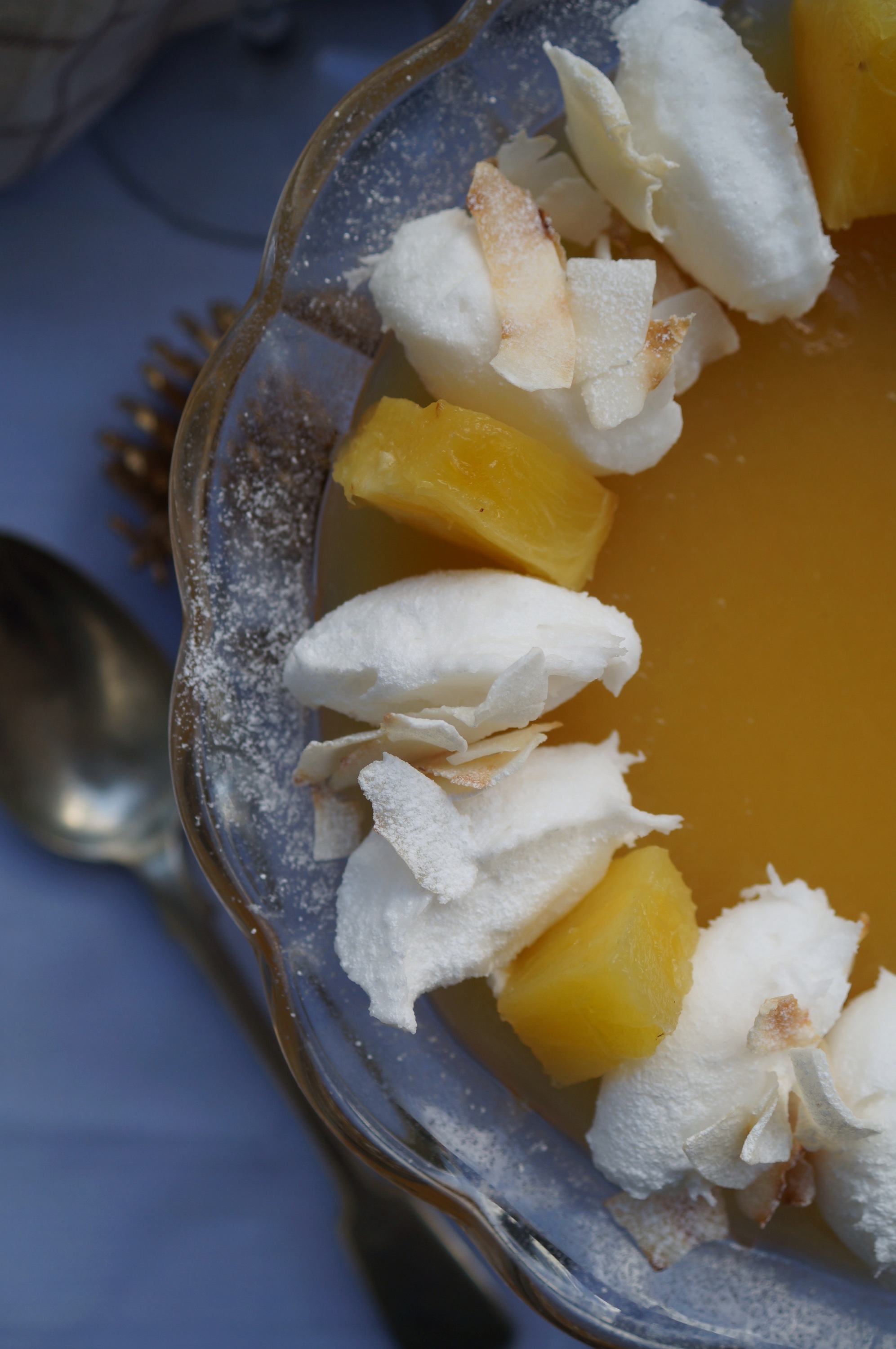 4. When the cake is ready, turn it out and leave it to cool completely on a wire rack. Then, cut into squares and use to line the base of a large glass bowl. Pour over 3 (or more) tablespoons of dark rum then top with the roasted pineapple pieces- reserving a few pieces for decorating. Set the whole thing aside while you make the coconut panna cotta layer.