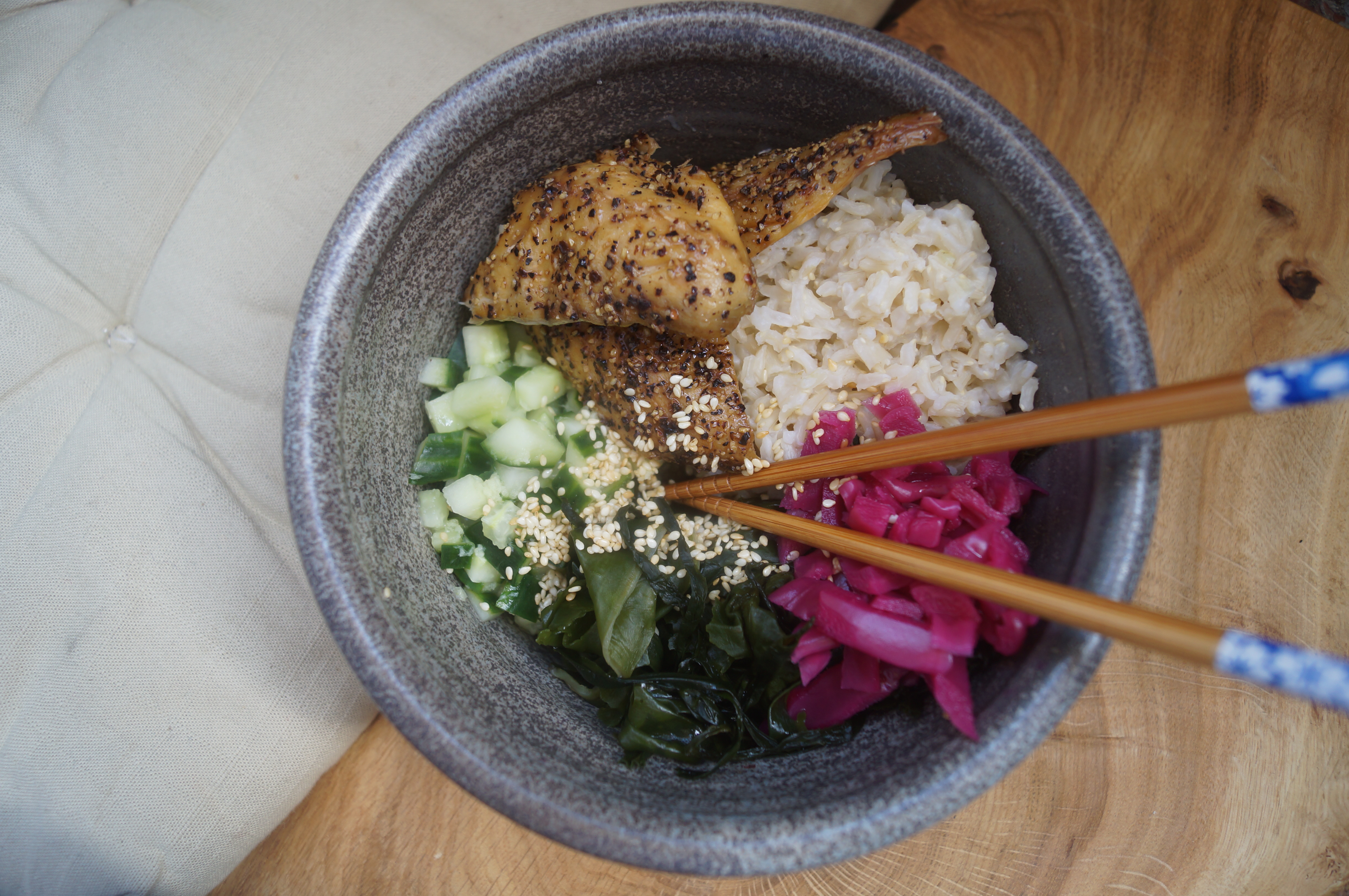 2. Next mix the cucumber, grated ginger and rice vinegar together in a nice bowl or soup dish then nudge it to one side to make space for everything else. Pile the cooked rice in down one side, tuck in the mackerel fillets, add the seaweed or spinach then the pickled cabbage and finally sprinkle the toasted sesame seeds over the rice. Add a spritz of soy sauce if you like but I’m not sure it’s necessary. Dig in!