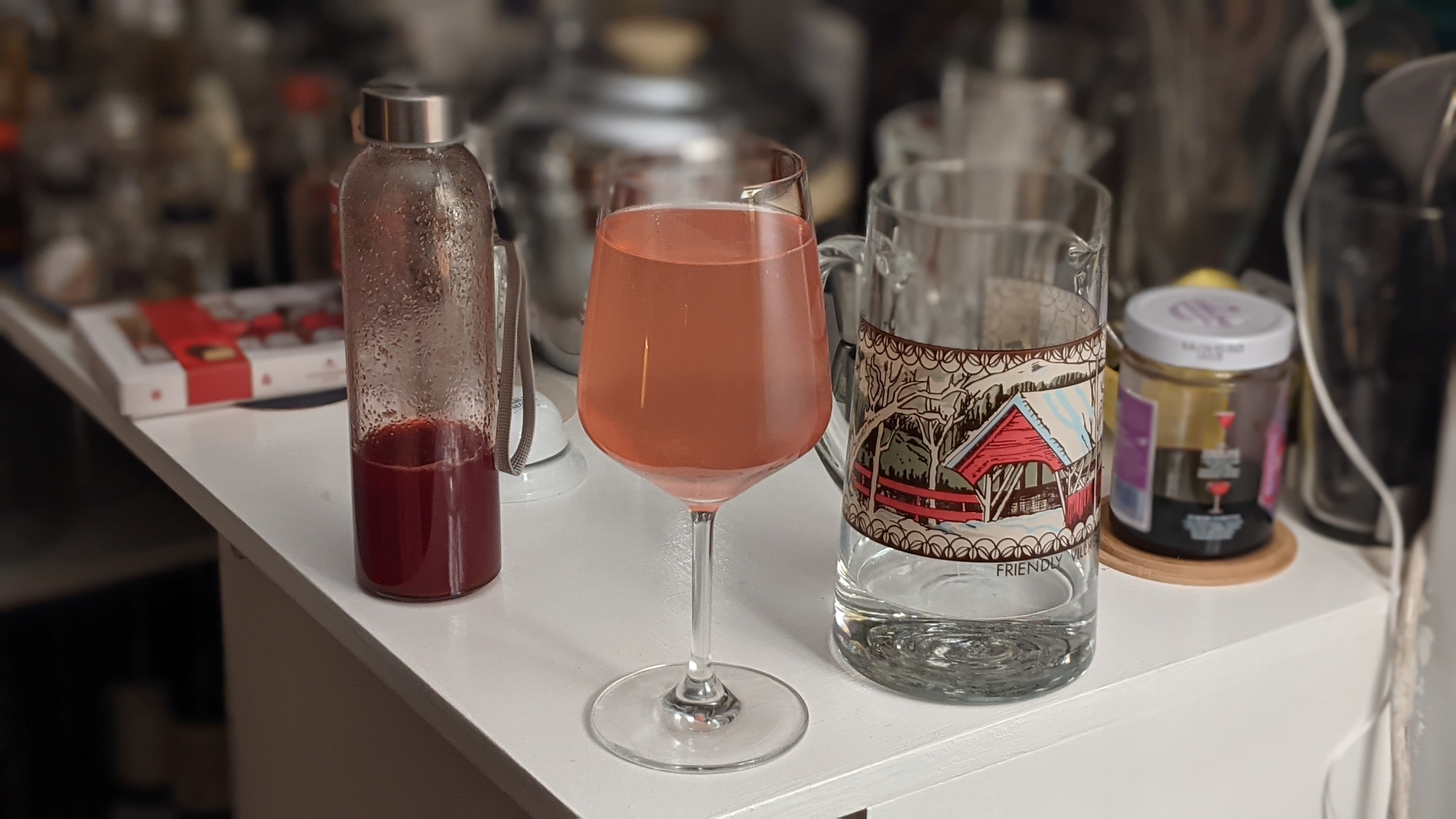 Had a lovely video call with my Mum on her birthday where we both ate fish and chips and drank wine…except, my wine was pretend wine. I made it inspired by Jukes cordialities, which are delicious, and in my mind somewhere between a thick cordial and a shrub (as they are vinegar-based). Once diluted they are convincingly wine-like, my favourite is their Jukes 6 which is their red wine cordial. But I only have one mini-bottle left which I’m saving and kinda felt more in a rosé mood, so I raided the freezer and spice cabinet and came up with this:
