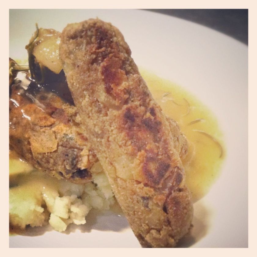I served mine with mashed potato (made with soya milk and olive oil) with spinach and nutmeg folded though it and a splash of onion and rosemary gravy.
